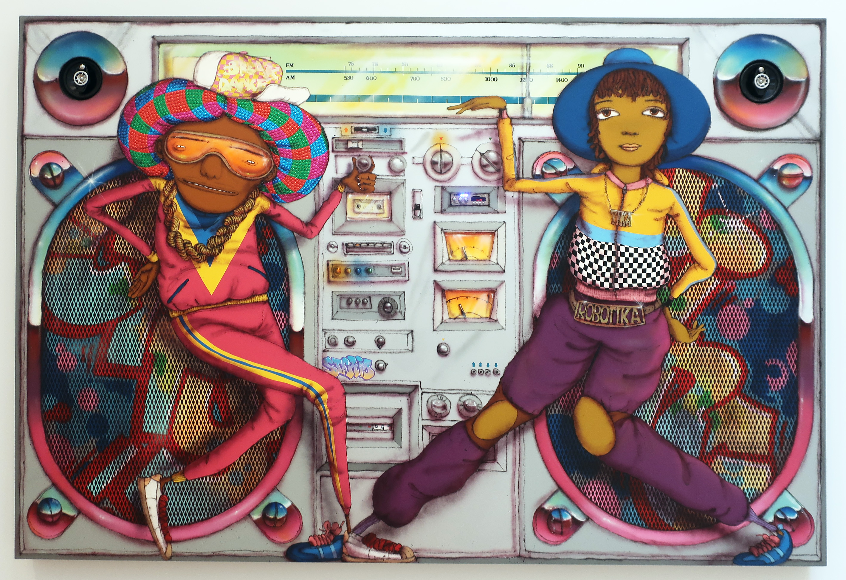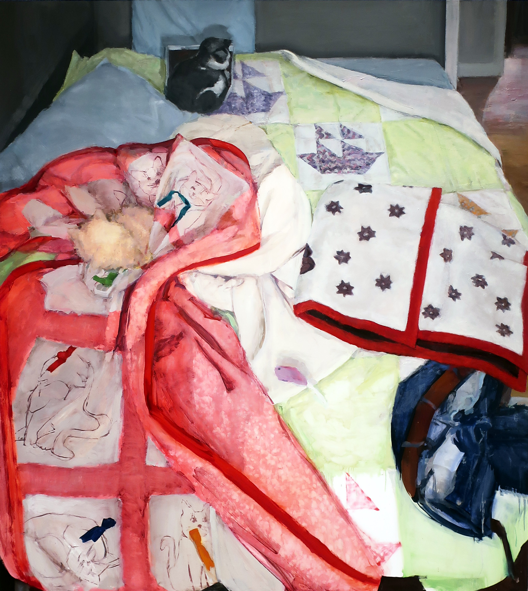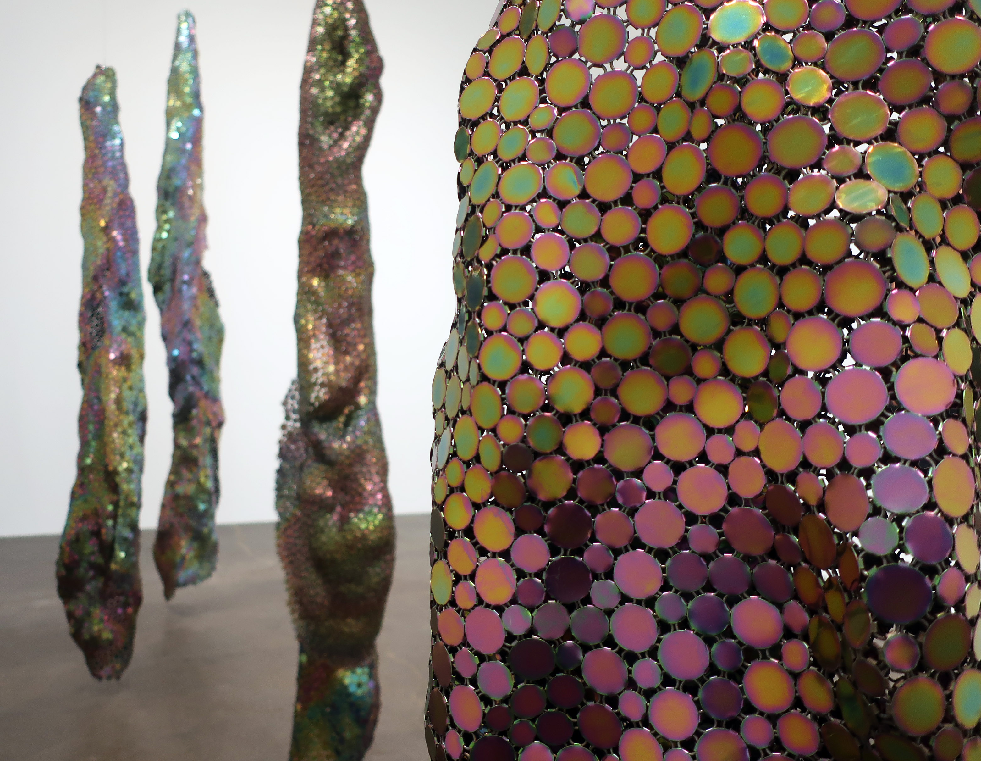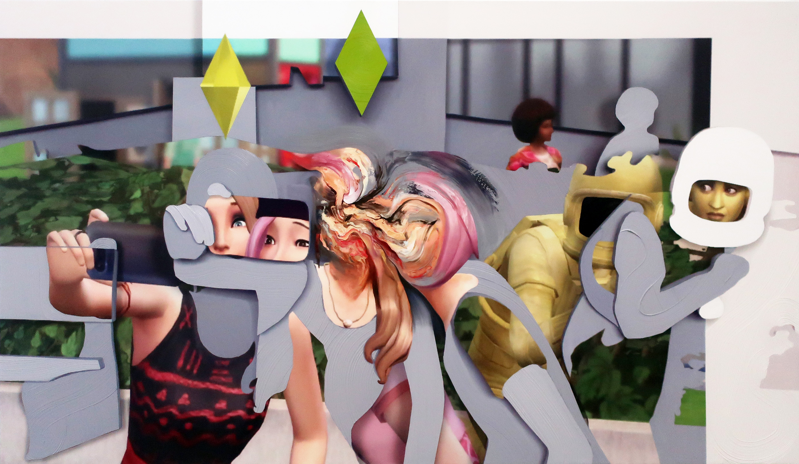 Lone insects, sharpened fingernails and portraits of impassive, semi-clad or nude characters lend young New York painter Gahee Park’s new paintings at Perrotin Gallery a sense of eerie calm and pervasive danger. Innuendo ranges from the obvious to subtle, here appearing in two speared olives and the fishs’ pretty lips not to mention the long red nails pulling down the blinds. A mini-cascade of eyes peers in past the shrimp-shaped nails to give the painting a surreal, voyeuristic charge. (On view on the Lower East Side through Oct 17th).