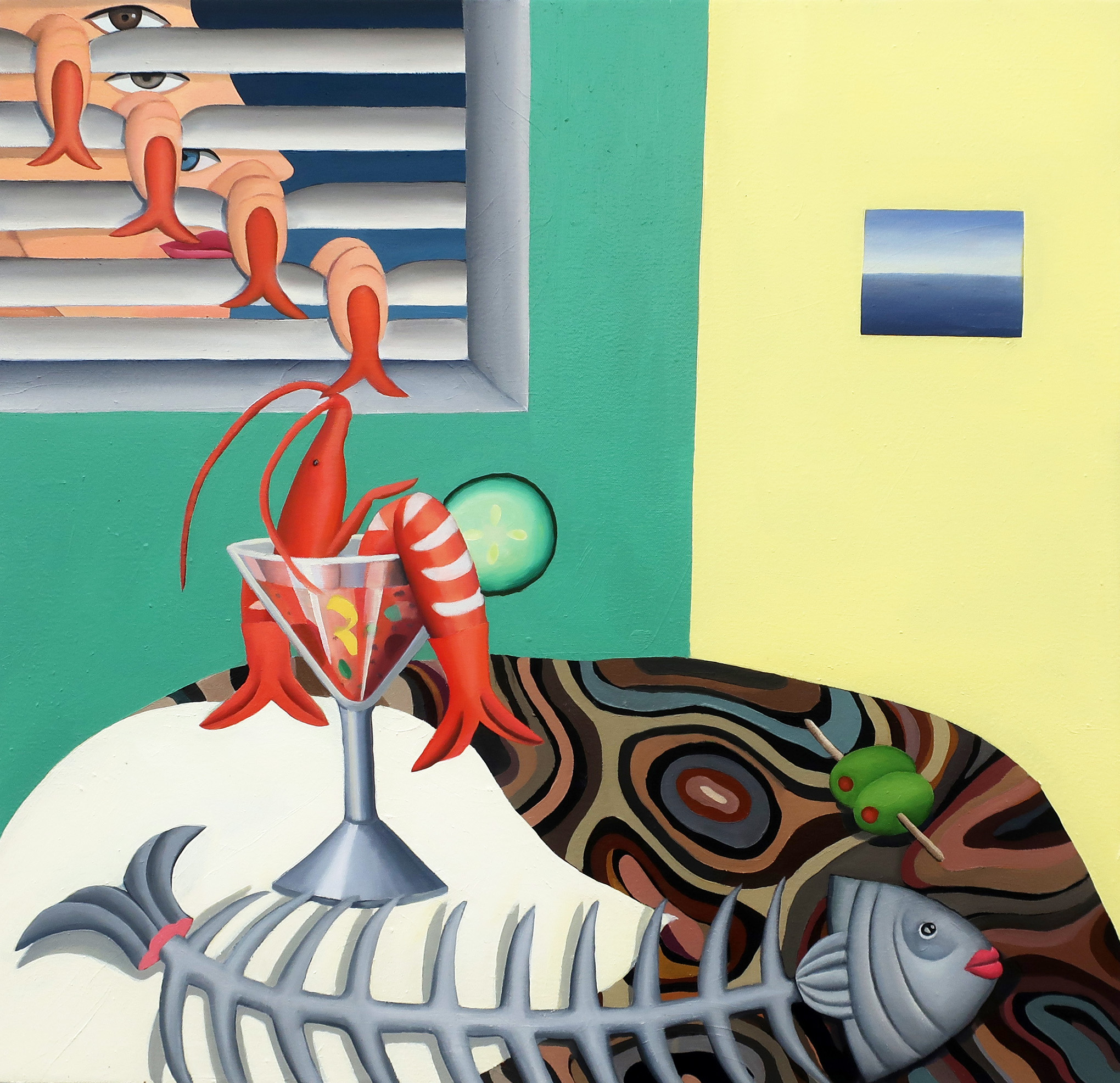 Lone insects, sharpened fingernails and portraits of impassive, semi-clad or nude characters lend young New York painter Gahee Park’s new paintings at Perrotin Gallery a sense of eerie calm and pervasive danger. Innuendo ranges from the obvious to subtle, here appearing in two speared olives and the fishs’ pretty lips not to mention the long red nails pulling down the blinds. A mini-cascade of eyes peers in past the shrimp-shaped nails to give the painting a surreal, voyeuristic charge. (On view on the Lower East Side through Oct 17th).